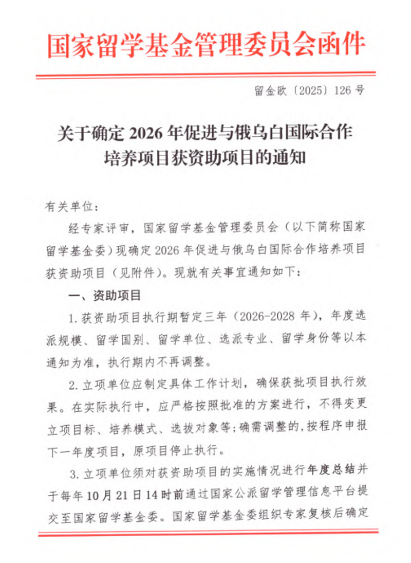 该项目自2026年起,在我校“控制科学与工程”、“计算机科学与技术”、“机械工程”、“软件工程”四个学科专业的应届本科毕业生中,每年选拔80人赴俄罗斯圣光机大学攻读相关专业的硕士学位。本项目暂定执行三年(2026年-2029年),由CSC提供全额学费、奖学金、交通费等资助。
