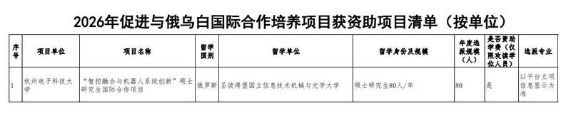近日,国家留学基金管理委员会(CSC)正式公布“2026年促进俄乌白国际合作培养项目”立项名单,杭州电子科技大学通过圣光机学院申报的“智控融合与机器人系统创新”硕士研究生国际合作项目成功获批!这是圣光机学院自开办以后成功获批的第五个CSC国家公派留学资助项目。